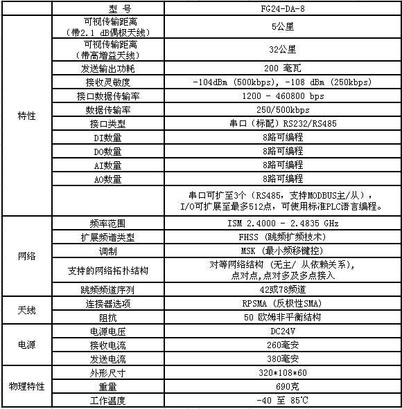 | FG24系列主要功能特点: 1. 采用免许可证的2.4GHz ISM(工业/科研/医疗)频段。 2. 低功耗、长距离、宽温度特点。 3. 高传输速率 4. 跳频扩频(FHSS)技术,提供高可靠性无线通讯。 6. 工业化结构设计 5. 组网方式灵活,使用扩展功能多样。 |